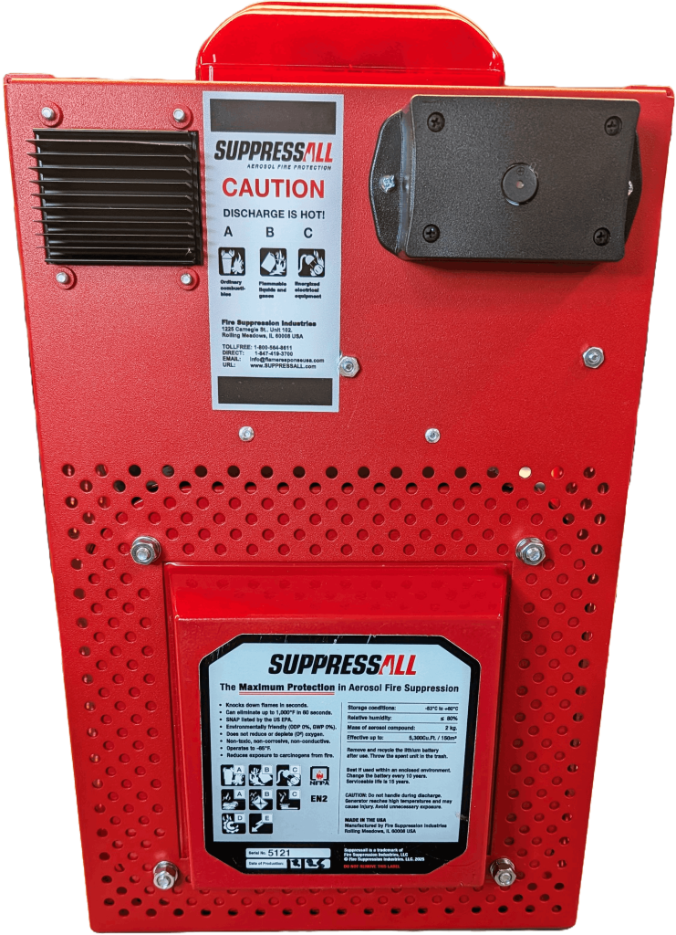 The Suppressall FS8100 Automatic Aerosol Fire Suppression System is specifically designed for smaller enclosures, offering a reliable fire detection and suppression solution. The FS8100 is manufactured in the USA and assembled in our facility in Rolling Meadows, IL USA